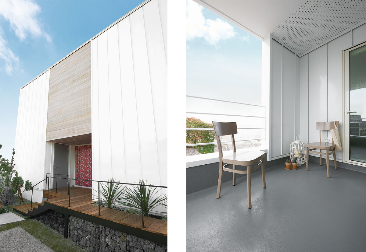 デッキはもちろんですが、2階にある屋根付きバルコニーが特徴的。半屋外空間なので、雨の日も外へ出ることができます。天候を気にせず洗濯物を干すことができ、ママにとってもうれしい空間です。(デッキはオプションです)